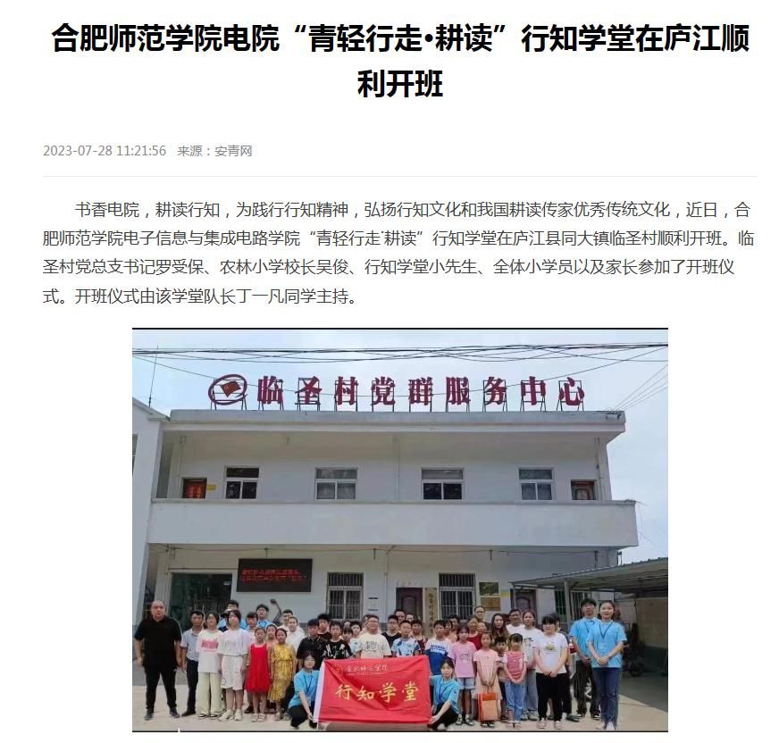 本网讯 7月28日,安青网以《tyc522cc太阳成集团电院“青轻行走·耕读”行知学堂在庐江顺利开班》为题对太阳成集团tyc522cc合肥市庐江县同大镇临圣村“行知学堂”进行了报道。