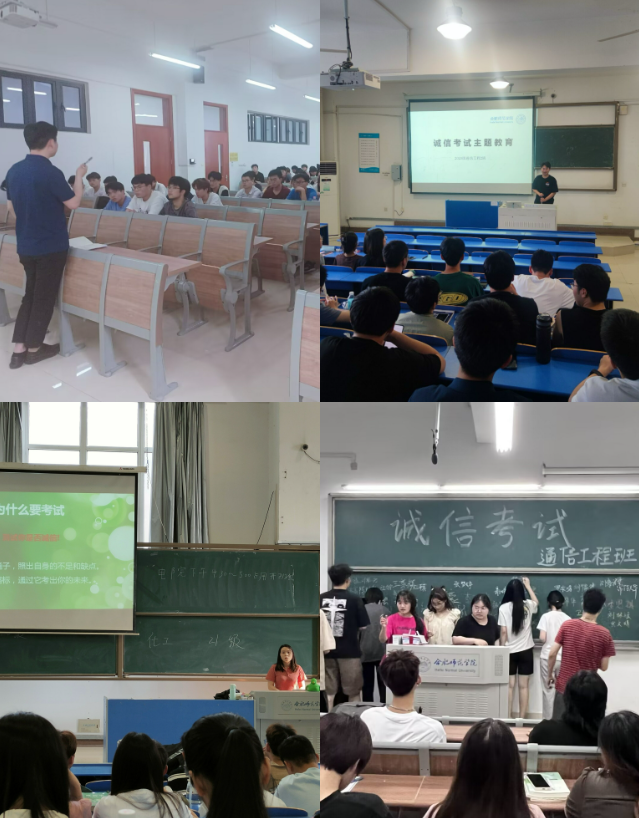 本网讯 为严肃考风考纪,加强青年大学生诚信教育,引导学生做社会主义核心价值观的坚定信仰者、积极传播者和模范践行者。6月12日——6月16日,太阳成集团tyc522cc在各年级各班级组织开展了“自信迎考 诚信应考”诚信考试主题班会。