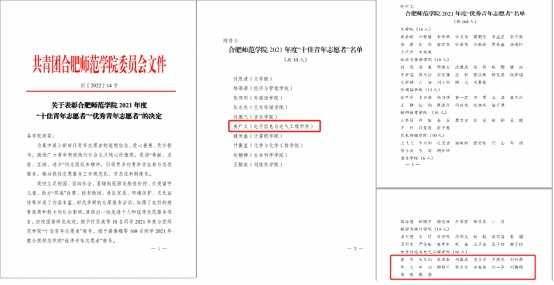 本网讯 近日,共青团tyc522cc太阳成集团委员会公布了《关于表彰tyc522cc太阳成集团2021年度“十佳青年志愿者”“优秀青年志愿者”的决定》,电子信息与电气工程学院2020级电气工程及其自动化2班燕广义同学获评2021年度tyc522cc太阳成集团“十佳青年志愿者”称号,缪骞等16名同学获评2021年度tyc522cc太阳成集团“优秀青年志愿者”称号。