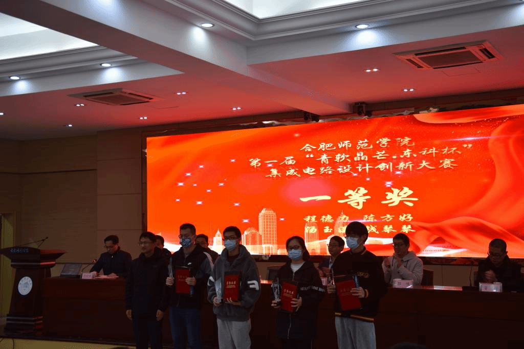 当日下午在锦绣校区学术报告厅举行了竞赛颁奖典礼,教务处副处长李健,电子信息与电气工程学院院长张忠祥、副院长范程华、微电子系主任鲁世斌,安徽青软晶芒微电子科技有限公司副总经理陶羽,青岛青软晶尊研发总监、高级工程师董科,东科半导体(安徽)股份有限公司高级工程师郭唯以及电子信息与电气工程学院师生代表参会。颁奖结束后,青岛青软晶尊研发总监、高级工程师董科为在座师生作了一场生动的“集成电路”专题讲座,参会师生积极交流互动。