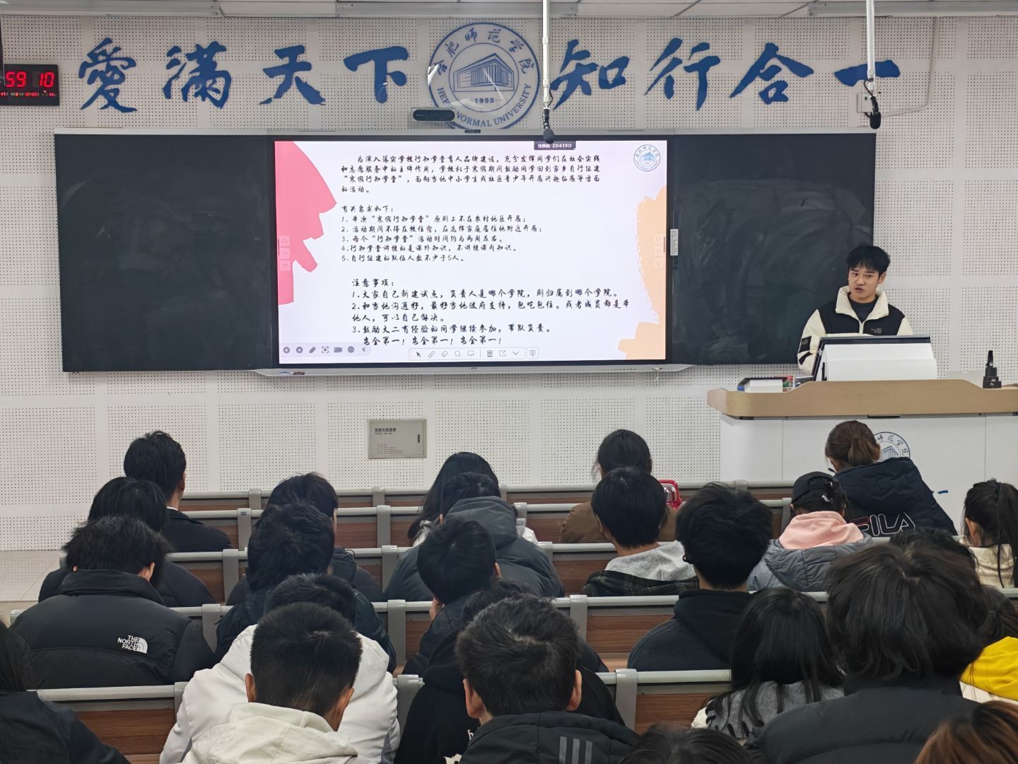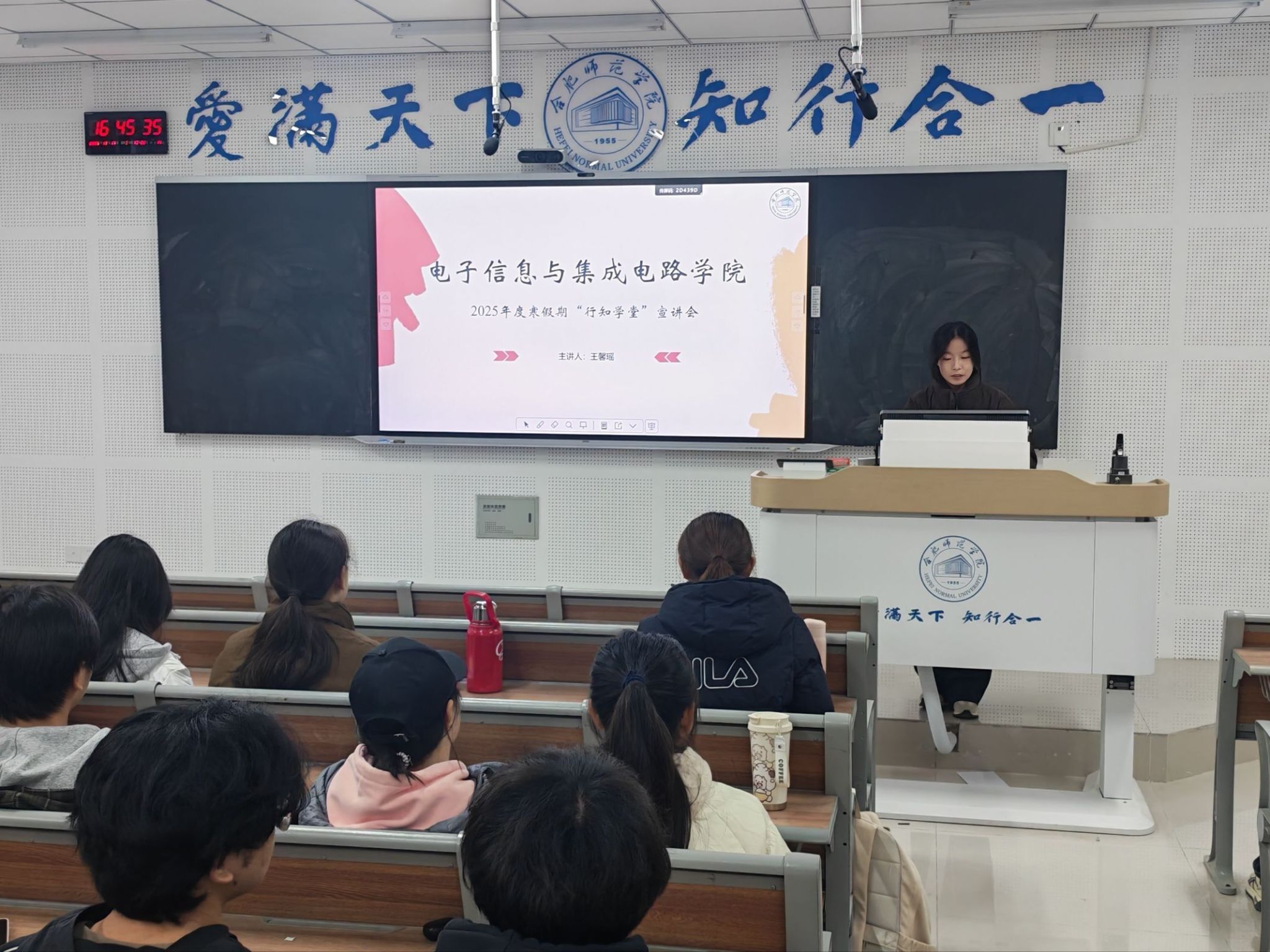 宣讲环节中,学院团委社会实践部王馨瑶同学通过《我是小先生》微视频,带领在场师生重温了往届实践活动中薪火相传的温暖瞬间。随后,王馨瑶依次介绍行知学堂自2012年起的发展历程、所获荣誉,以及往期实践基地情况,同时明确寒假活动具体开展要求与安全注意事项,助力同学们全面明晰参与路径。
